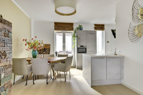 De eetkamer loopt over in de prachtige, open keuken (2022) die is gelegen aan de voorzijde en is voorzien van een vrijstaand 6-pits gasfornuis met driedubbele oven en een fraai weggewerkte afzuigkap, kokend waterkraan, koel-vriescombinatie en een aparte koelkast, wijnklimaatkast en natuurlijk een vaatwasser. Er is hier gekozen voor een lichte kleurstelling wat met de grote ramen een bijzonder fraai beeld geeft.